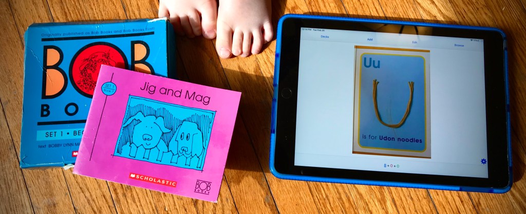Two or three weeks in, it turns out that my four-year-old enjoys doing flashcards on the tablet, which means we can spend about ten minutes a day on reading without him throwing any fits. He doesn’t have the Bob Books memorized anymore, but by the time we get to a given book he knows all the words well enough that he doesn’t get too stressed. He always insists, “Get an easy book!”, and my plan is that each book should already seem easy by the time we get to it.