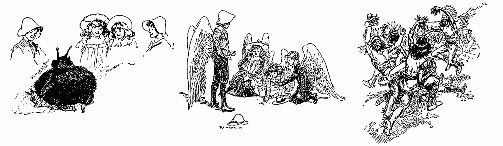 Is this just satirizing white people for their simplistic stereotyping of Indians? I’d say no, as the children then escape because they have created fake hair with strips of black fabric, which the Indians then “scalp.” Nesbit writes, “The poor untutored savages had indeed scalped the children. But they had only, so to speak, scalped them of the black calico ringlets!” I know it’s supposed to be silly, but it’s done with a very nasty stereotype I don’t want in my kids’ heads.